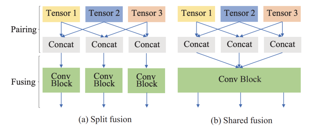 Conv block包含两层卷积,卷积核大小都是3*3,channel为128, 256。Concat即特征融合,在通道维度上融合。图(a)是不共享conv block的参数,其效果要好于图(b)的共享参数block,但相应的参数也增多。
