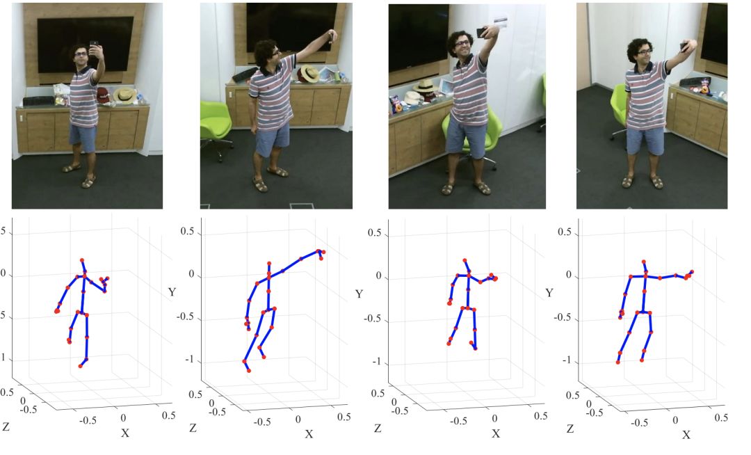 光学估计和穿戴式传感器是目前常用的两种三维运动数据采集方法。而光学估计会受到机位和视角的影响,即对同一段动作,在不同的机位和角度下,估计得到的3D骨骼数据是有差异的: