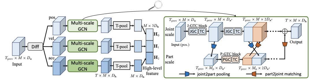 首先将人体分为多个part,每个part内的关节取平均值,这样每个part就变成了一个节点这么做相当于降低了图的分辨率。两个数据流通过pooling和matching的方法进行特征交互。Matching是将part scale图的单个节点复制多次,得到joint scale图。
