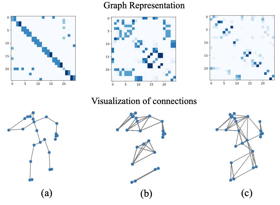 图(a)是关节的原始关节骨骼连接,图(b)是空间图路由学习到的关节连接,图(c)是时间图路由学习到的连接。