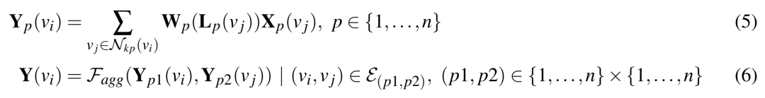其中(5)表示在分图p中的点vi的卷积结果,Nkp是点vi在子图p中的邻接节点集合,Wp表示点子图p的权重矩阵(不与其他子图共享),(6)表示点vi与相邻子图的邻接节点之间的信息聚合。其中聚合函数定义如下: