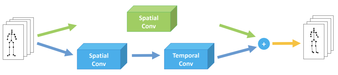 上方绿色部分是本文使用的残差连接,而ST-GCN是用的残差连接只有简单的通道变换,没有邻接矩阵参与运算。