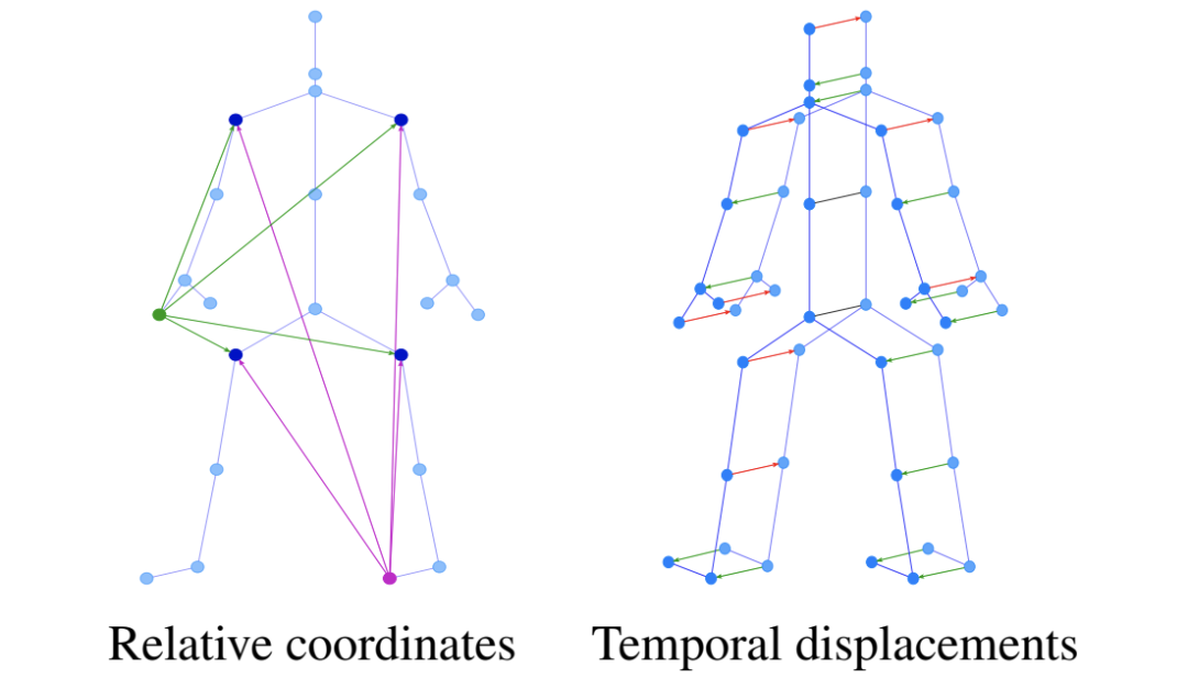 这里的几何信息就是骨骼特征(包含非骨骼连接),即在空间上计算相邻关节坐标差值,动力学特征就是运动特征,通过计算相邻帧对应关节的差值得到。