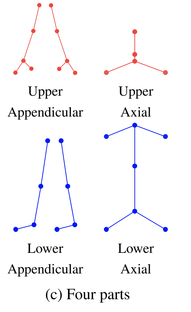 由于不同子图之间不共享权重,因此子图划分策略就异常重要。本文提出了多种不同的划分策略,可以按上下不同肢体划分,可以按左右划分,其中效果最好的是四部划分: