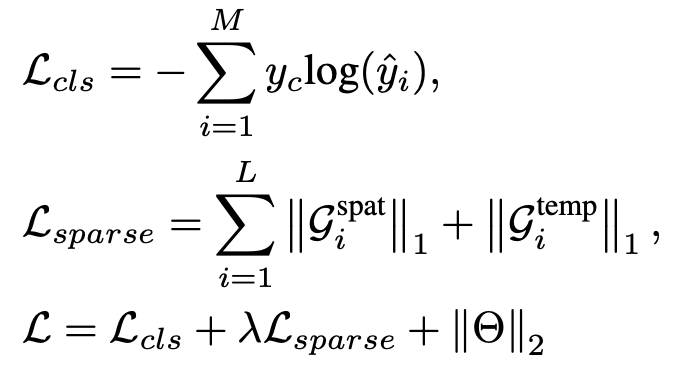 。这个公式和ST-GCN很相似,只不过ST-GCN中只有三个不同的空间图,没有时间图。因此本文的工作实际上就是在ST-GCN的基础上,增加了两个额外的邻接矩阵策略,其他地方没有明显改动。优化时不仅使用分类损失函数,还使用图稀疏损失函数,以确保图的稀疏性: