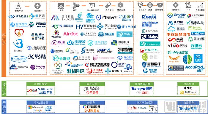 根据依赖应用服务对象、使用医疗环节、医疗应用病种范围,报告制作了医疗人工智能应用矩阵,并对我国医疗人工智能行业进行了总结,制作出了医疗人工智能行业图谱。