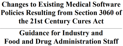 [21] FDA CDRH, CBER. Changes to Existing Medical Software Policies Resulting from Section 3060 of the 21st Century Cures Act. Sept 27, 2019. Retrieved Sept 29, 2019 from https://www.fda.gov/media/109622/download