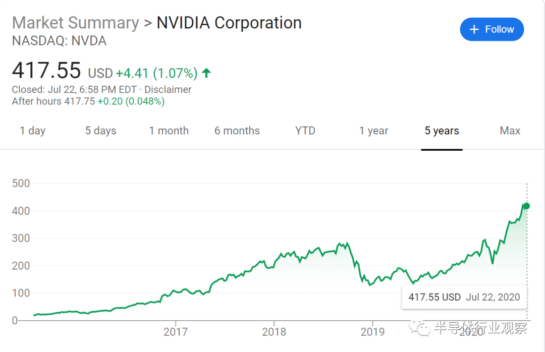 与软银自2016年开始走下坡路不同,Nvidia从2016年至今股价已经涨了8倍有余。作为半导体行业