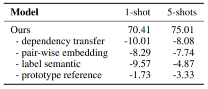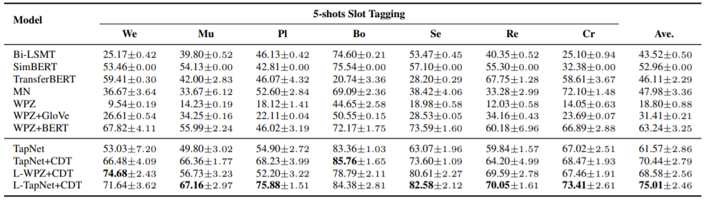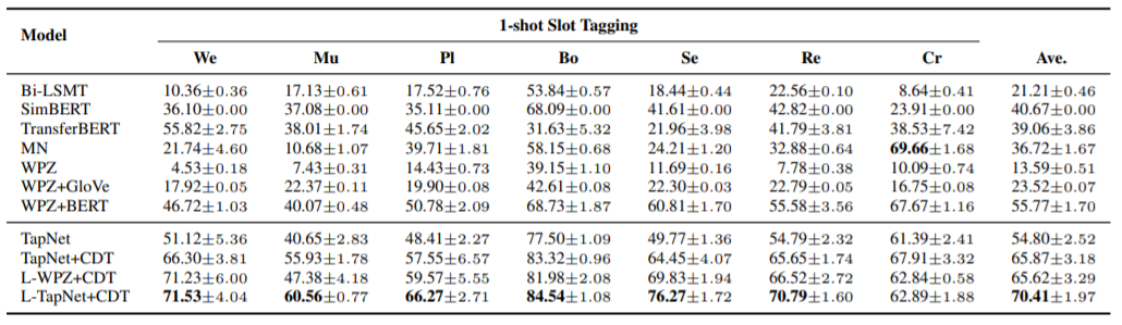 Slot Tagging 和 NER的实验结果(表1 - 4)显示我们的模型(Ours)取得了最最优效果,并大幅领先最强的已有模型。同时,建模跨领域的标签依赖关系(CDT)和考虑标签名语义能够稳定地提升模型表现。此外,我们可以看到少样本方法相对传统方法(TransferBERT,Bi-LSTM等)的巨大优势。