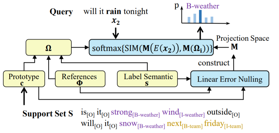 为了在小样本情形下得到每个词的标签概率(Emission Score),我们提出L-TapNet,来基于每个词和不同标签表示的相似度计算属于不同标签的概率。L-TapNet在计算时利用了label名字中的语义信息,并通过线性偏差消除法(Linear-error Nulling)构造映射空间来将不同标签类别在embedding空间有效分开。