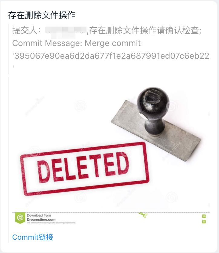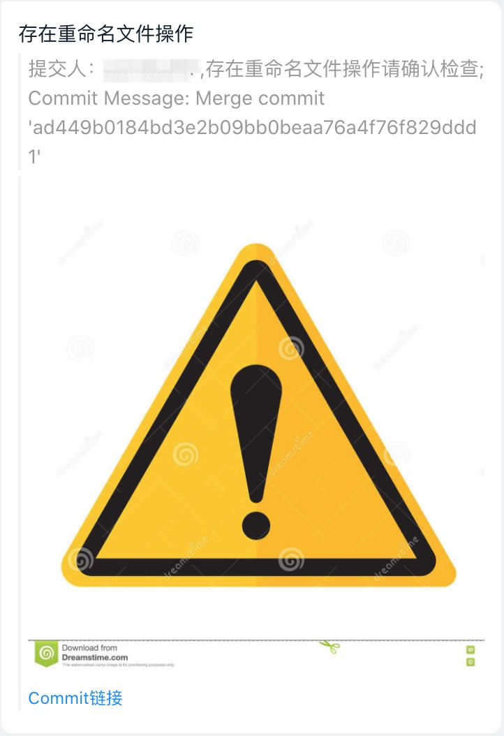 消息告警:对不符合规范以及大代码量提交、删除文件等操作发送告警消息。