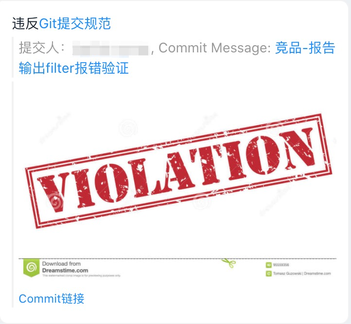 通常提出一个规范之后,为了大家更好的执行规范,就需要进行一系列的拉通,比如分享给大家这种规范的优点、能带来什么收益等,在大家都认同的情况下最好有一些强制性的措施。当然git commit规范也一样,前期我们分享完规范之后考虑从源头进行强制拦截,只要大家提交代码的commit message不符合规范,直接不能提交。但由于代码仓库操作权限的问题,我们最终选择了使用webhook通过发送警告的形式进行监控,督促大家按照规范执行代码提交。除了监控git commit message的规范外,我们还加入了大代码量提交监控和删除文件监控,减少研发的代码误操作。