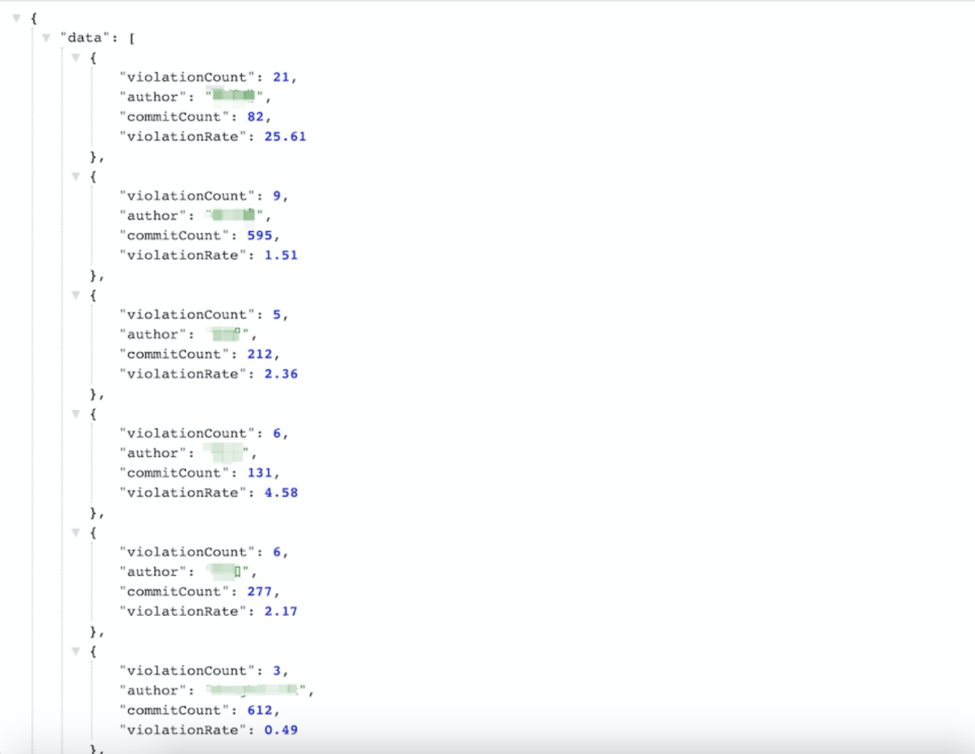 我们也有整体git commit的统计,统计个人的提交次数、不规范次数、不规范率等如下图: