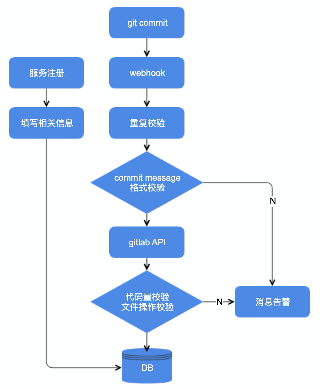 webhook是作用于代码库上的,用户提交git commit,push到仓库的时候就会触发webhook,webhook从用户的commit信息里面获取到commit message,校验其是否满足git commit规范,如果不满足就发送告警消息;如果满足规范,调用gitlab API获取提交的diff信息,验证提交代码量,验证是否有重命名文件和删除文件操作,如果存在以上操作还会发送告警消息,最后把所有记录都入库保存。