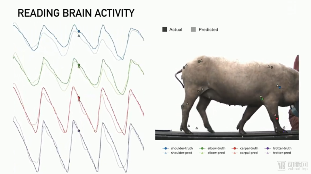 在第二只跑步机上的小猪视频中,他演示了用脑电波进行运动轨迹的预测。图表显示,预测的运动轨迹和真实的运动轨迹基本吻合。