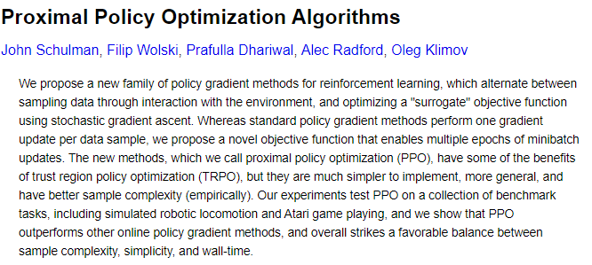 PPO是ArXiv 2017的一篇论文,Proximal Policy Optimization Algorithms,论文网址: https://arxiv.org/abs/1707.06347