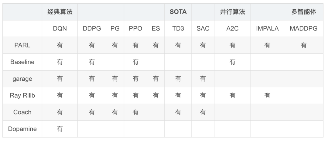 - 最后不得不提的是百度 的 PaddlePaddle 和 PARL,这是一套完整的深度学习 和强化学习 框架。从初期学习,到中期实践,到后期落地,这套框架给开发者和研究者带来了极大的便利。PARL 作为专精于强化学习 的框架,免除了我们重复造轮子的痛苦,可以专注于不同算法的核心优劣对比和研究,确实节约了我们大量的时间。就我自己而言,以后做相关的研究和论文撰写,PaddlePaddle 和 PARL 一定会是我的首选!