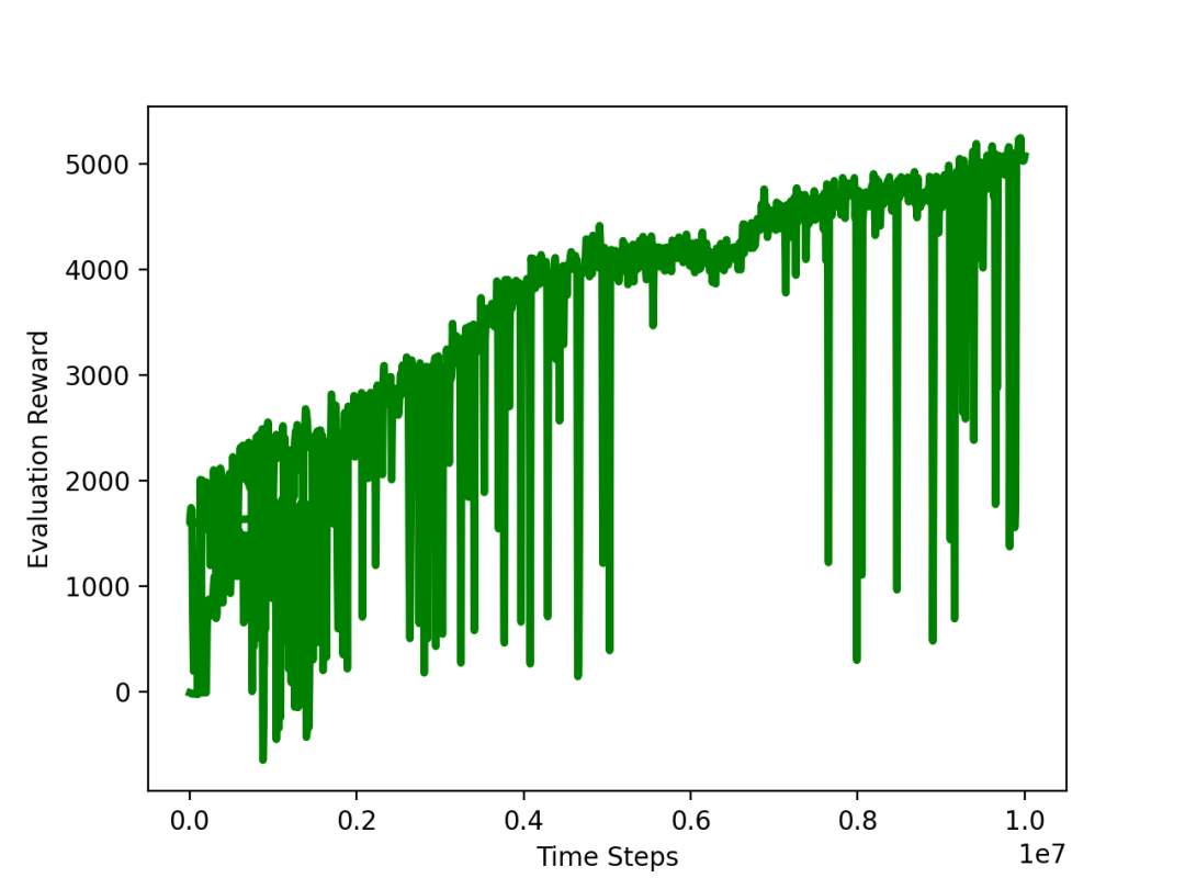 如果 收敛 趋势明显,那就可以放着让电脑训练,睡一觉以后看最后训练效果。可以看到最终的 收敛 曲线,也就是获得奖励上涨的趋势如本文开头的图示。调取训练过程中保存的中间模型,放到测试代码中开启渲染运行,就可以看到我们的小猎豹成长的过程喜人,从呆着不动,到乱七八糟地晃动,再到逐渐可以移动,最后可以比较顺畅地完成奔跑,整个过程还是让人很有成就感的!