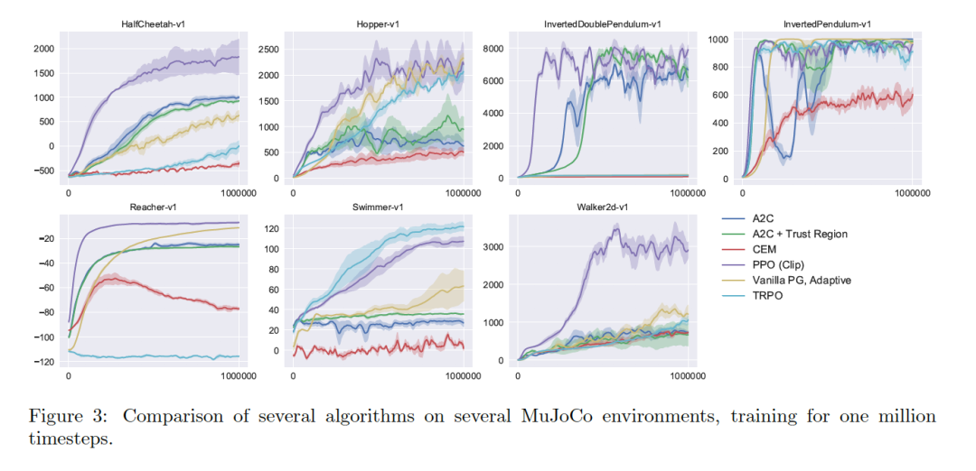 可以看到,在复杂的 连续控制 环境下,PPO取得的效果也非常不错。
