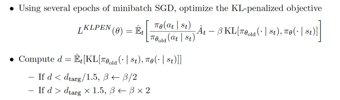另外一种方法是用 KL 惩罚因子来代替截断的方法: