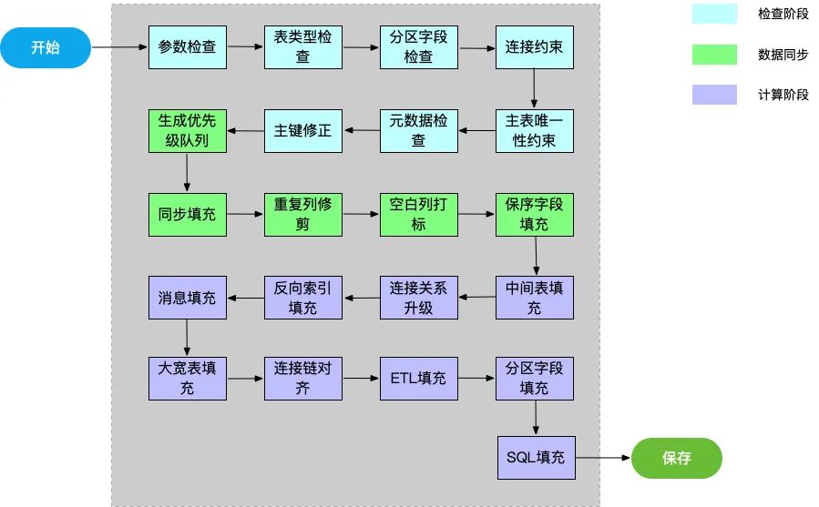 同步填充:填充源表对应的同步阶段HBase表数据,和对应的配置项, 类型转换(比如源表是MySQL表,字段类型要转换为HBase的类型), ETL填充, 添加消息队列(通过发送消息的方式通知下游节点运行)。