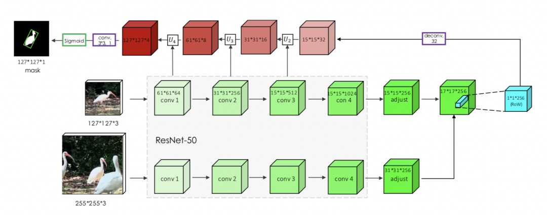 获得mask,得到带有方向的包围框,能更好地贴合目标的旋转和变化,以达到更高的IoU。SiamMask还应用了Depthwise Cross-correlation的方式,解决SiamRPN非对称的问题,并使用ResNet作为网络主体加深网络深度,以获得更多层次的特征。