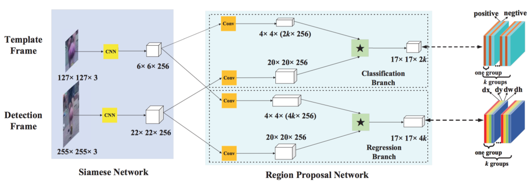 - 在RPN分类分支中,模板图像和检测图像的feature map都先经过一个卷积层,该卷积层主要对模板图像的feature map进行channel升维,使其变为检测图像feature map通道数的2k倍(k为RPN中设定的anchor数)。此后,将模板图像的feature map在channel上按序等分为2k份,作为2k个卷积核,在检测图像的feature map完成卷积操作,得到一个维度为2k的score map。该score map同样在channel上按序等分为k份,得到对应k个anchor的k个维度为2的score map,2个维度分别对应anchor中前景(目标)和后景(背景)的分类分数。