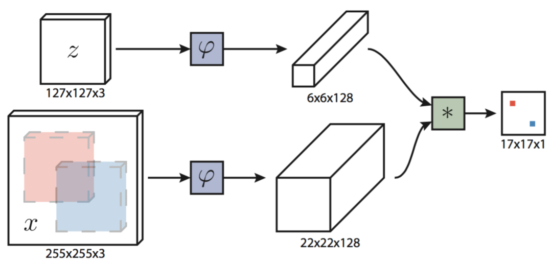 使用交叉相关(cross-correlation)作为相似度的度量,计算两个feature map各个位置(区域)上的相似度,得到一个17×17×1的score map。该score map计算方式类似卷积,即: