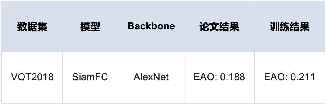 使用VOT2018数据集,SiamFC指标与paper公开指标对比如下: