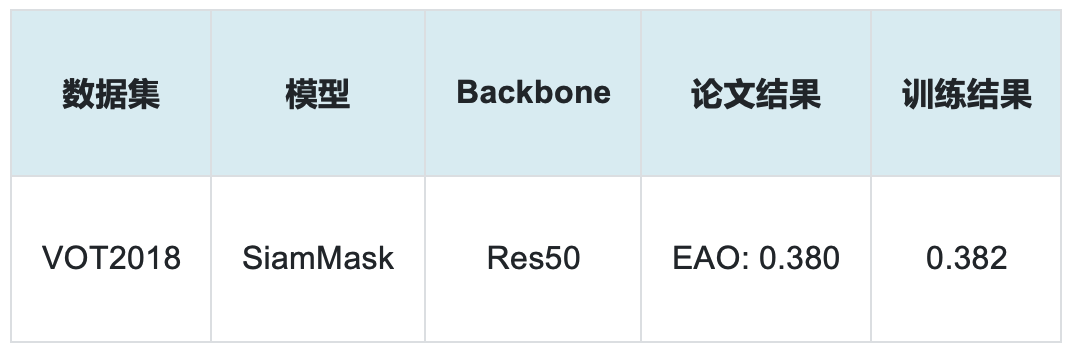 使用VOT208数据集,SiamMask指标与paper公开指标对比如下: