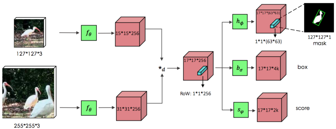 图 SiamMask网络结构SiamRPN预测出的包围框结果更加精确,主要体现在包围框的尺寸和长宽比上,但是这些包围框都是轴对齐的包围框,不能很好地适应目标的旋转和变化。SiamMask基于SiamRPN,在score分支和bbox分支基础上增加了mask分支,同时对目标进行位置、大小和分割的预测,利用
