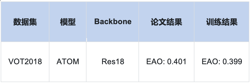 使用VOT208数据集,ATOM指标与paper公开指标对比如下: