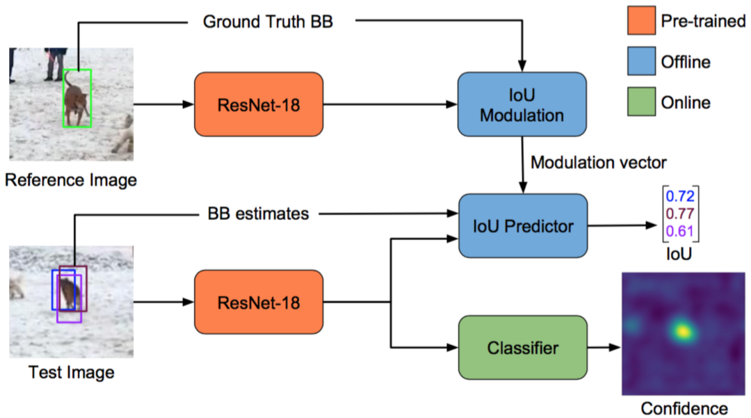 实际测试过程中,首先将上一帧物体坐标和尺寸作为Reference,利用目标分类模块计算当前帧的confidence map,将最高得分的位置作为目标在当前帧中的位置。这个坐标位置和前一帧中计算的目标size一起,就构成了初始的目标框。接下来基于该目标框, 论文生成 10个推荐区域,并利用目标估计模块计算它们与Reference的IoU数值,取前三个最大值对应的目标框,然后将它们的平均值作为最终的目标框,实现物体的在线跟踪。