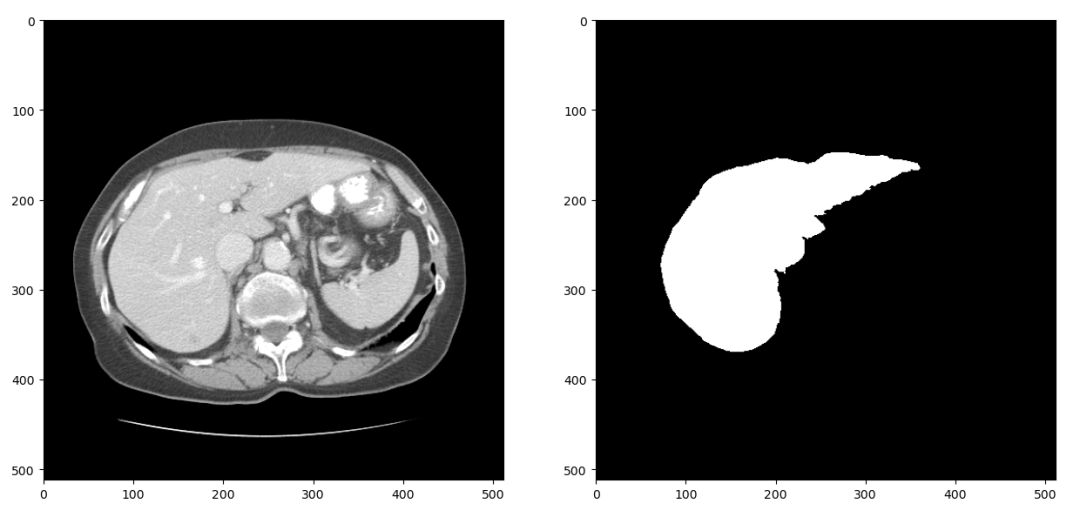 上述的Res-Unet结构是一个2D的分割网络,因此我们首先将LiTS数据集中3D的CT扫描分成2D的切片。CT在拍摄和重建的过程中会引入一些噪声,因此我们只保留-1024到1024范围内的数据。经过这两步处理,可以得到大概1万张CT扫描切片及对应的分割标签,随机选择一组进行可视化结果如下: