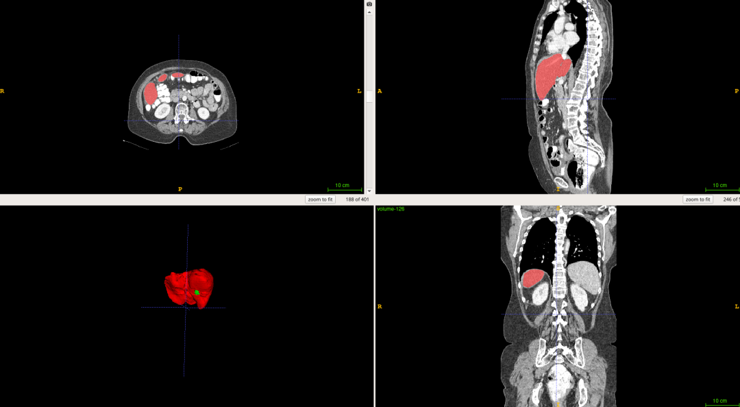 算法对一组CT扫描进行分割大概耗时15S,其效率明显高于医生阅片的效率。而且从分割结果中,我们可以计算获得肝脏体积,肿瘤数量,肿瘤体积,肝脏肿瘤负担等数