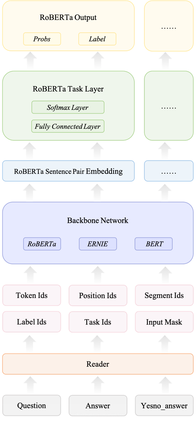 https://github.com/PaddlePaddle/PALM He W, Liu K, Liu J, et al. Dureader: a chinese machine reading comprehension dataset from real-world applications[J]. arXiv preprint arXiv:1711.05073, 2017. Rajpurkar P, Zhang J, Lopyrev K, et al. Squad: 100,000+ questions for machine comprehension of text[J]. arXiv preprint arXiv:1606.05250, 2016. https://github.com/PaddlePaddle/Paddle Sun Y, Wang S, Li Y, et al. Ernie: Enhanced representation through knowledge integration[J]. arXiv preprint arXiv:1904.09223, 2019. Devlin J, Chang M W, Lee K, et al. Bert: Pre-training of deep bidirectional transformers for language understanding[J]. arXiv preprint arXiv:1810.04805, 2018. Miyato T, Dai A M, Goodfellow I. Adversarial training methods for semi-supervised text classification[J]. arXiv preprint arXiv:1605.07725, 2016. Dietterich T G. Ensemble methods in machine learning[C]//International workshop on multiple classifier systems. Springer, Berlin, Heidelberg, 2000: 1-15. Vaswani A, Shazeer N, Parmar N, et al. Attention is all you need[C]//Advances in neural information processing systems. 2017: 5998-6008. Taylor W L. “Cloze procedure”: A new tool for measuring readability[J]. Journalism quarterly, 1953, 30(4): 415-433. Ross A S, Doshi-Velez F. Improving the adversarial robustness and interpretability of deep neural networks by regularizing their input gradients[C]//Thirty-second AAAI conference on artificial intelligence. 2018. Sun Y, Wang S, Li Y, et al. Ernie 2.0: A continual pre-training framework for language understanding[J]. arXiv preprint arXiv:1907.12412, 2019. Wei J, Ren X, Li X, et al. NEZHA: Neural Contextualized Representation for Chinese Language Understanding[J]. arXiv preprint arXiv:1909.00204, 2019. Yang Z, Dai Z, Yang Y, et al. Xlnet: Generalized autoregressive pretraining for language understanding[C]//Advances in neural information processing systems. 2019: 5754-5764. Lan Z, Chen M, Goodman S, et al. Albert: A lite bert for self-supervised learning of language representations[J]. arXiv preprint arXiv:1909.11942, 2019. Chen T, Guestrin C. Xgboost: A scalable tree boosting system[C]//Proceedings of the 22nd acm sigkdd international conference on knowledge discovery and data mining. 2016: 785-794.
