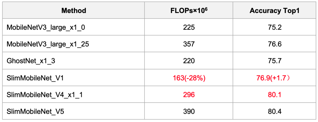 在ImageNet 1000分类任务上,相比于MobileNetV3, SlimMobileNet_V1在精度提升1.7个点的情况下FLOPs可以压缩28%。SlimMobileNet_V4_x1_1为业界首个开源的FLOPs不超 300M,ImageNet精度 超过80%的分类小模型。