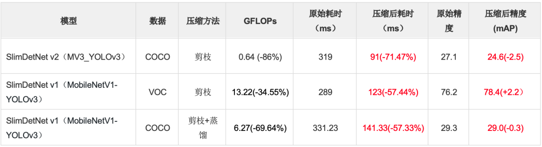 PaddleDetection发布了一系列 YOLO 模型,PaddleSlim在其基础上进行了蒸馏、 量化 和 剪枝 等压缩操作,产出了SlimDetNet系列图像 目标检测 模型。以MobileNetV1网络为主干的 YOLO v3模型,适用于移动端部署环境,因为冗余信息更少,所以压缩难度较大,在PaddleSlim 剪枝 和蒸馏的共同作用下模型 参数 和计算量均有65%以上的减少,同时精度只有略微的降低。具体实验数据如表2所示。