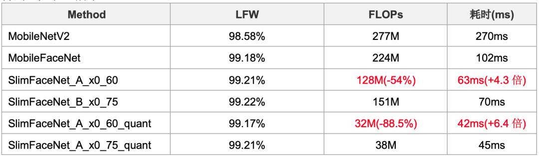 MobileFaceNet是之前业界开源的一个网络,SlimFaceNet_A_x_60_quant计算量只有MobileFaceNet的七分之一,延时降低了59%。