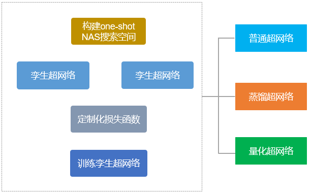 One-Shot NAS是一种自动搜索方法。它将超网络训练与搜索完全解耦,可以灵活的适用于不同的约束条件,超网络训练过程中显存占用低,所有结构共享超网络 权重 ,搜索耗时加速显著。与此同时,我们还研发了基于自监督的排序一致性算法,以确保超网络性能与模型最终性能的一致性。