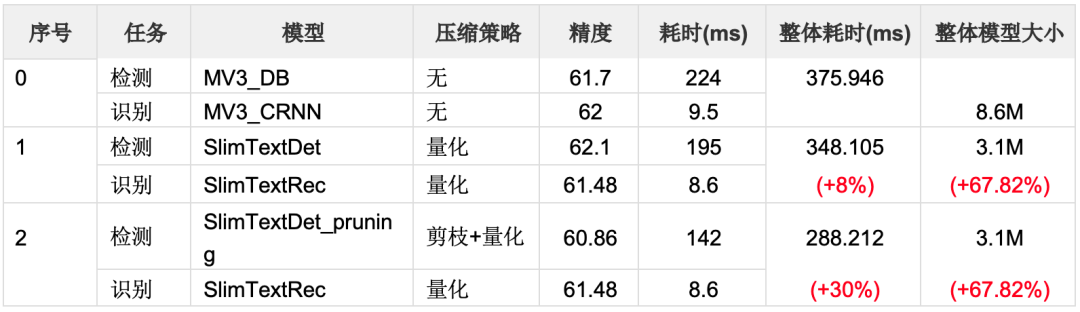 注:表中识别模型耗时为单个候选框的识别耗时,一张图片可能有多个候选框。使用自建中文数据集,测试环境是骁龙855。