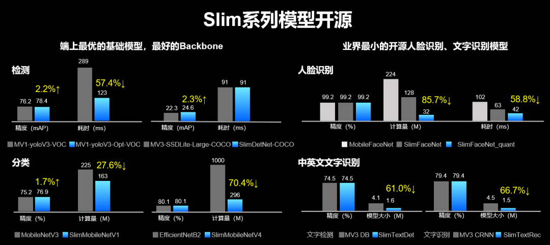 近日,PaddleSlim发布了SlimMobileNet、SlimFaceNet、SlimDetNet、SlimTextNet四大系列13个业界领先的工业级小模型。