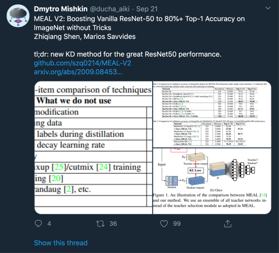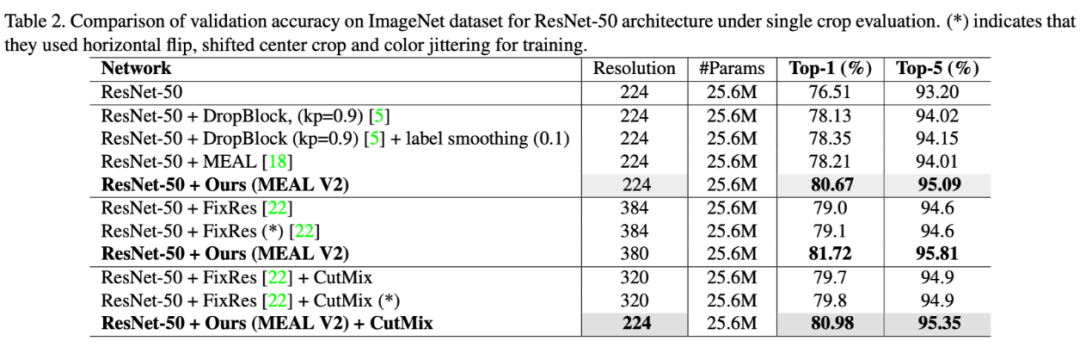 同时我们也不得不反思一下,是否一些新设计的网络结构真的有那么大的进步和贡献,毕竟从 MEAL V2 的实验结果来看,到目前为止原生的 ResNet-50 的性能都还没有完全饱和,这也促使我们更理性、客观的去评价其他一些看上去性能很好的模型结构。