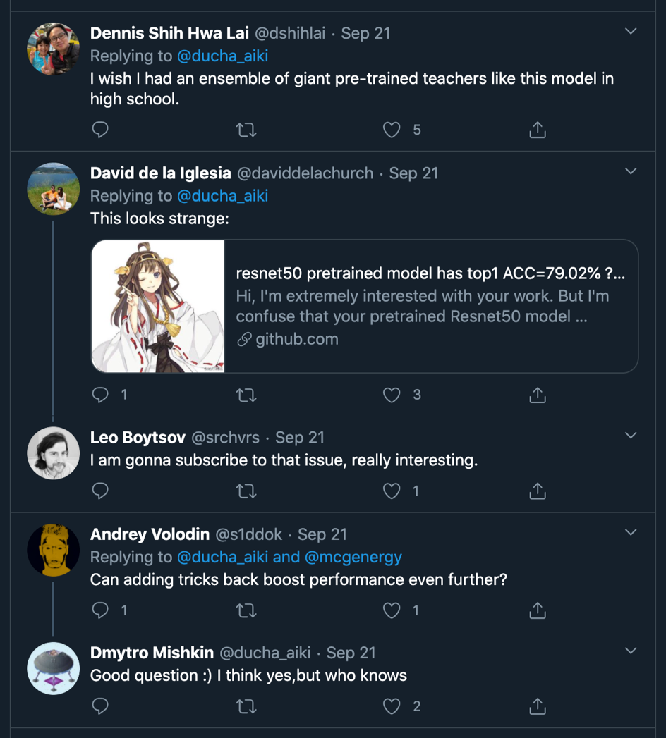 最后,Twitter 大佬 Dmytro Mishkin 也转发了这篇文章,同时还有一些有意思的讨论,关注他的人包括深度学习第四巨头 Andrew Ng,英伟达 AI 和机器学习负责人,同时也是加州理工大学教授的 Anima Anandkumar,还有 timm 库的作者 Ross Wightman 等等。