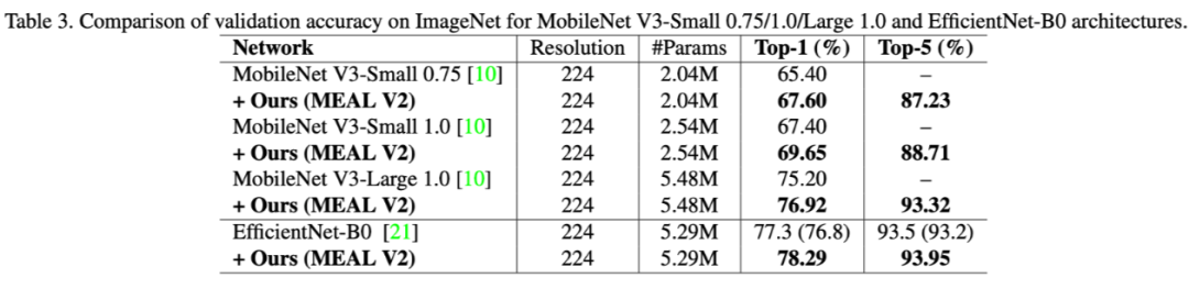 作者在论文中展示了如何提升不同网络结构的性能,包括 MobileNet V3,EfficientNet-B0 等等,从表格 3 我们可以看到基本在这些网络上都能有 2 个点以上的提升,所以 MEAL V2 整个框架其实可以看成是一个后增强的过程,即我们可以先设计和训练一个自己的模型,然后放入 MEAL V2 的框架中进一步提升它的性能。