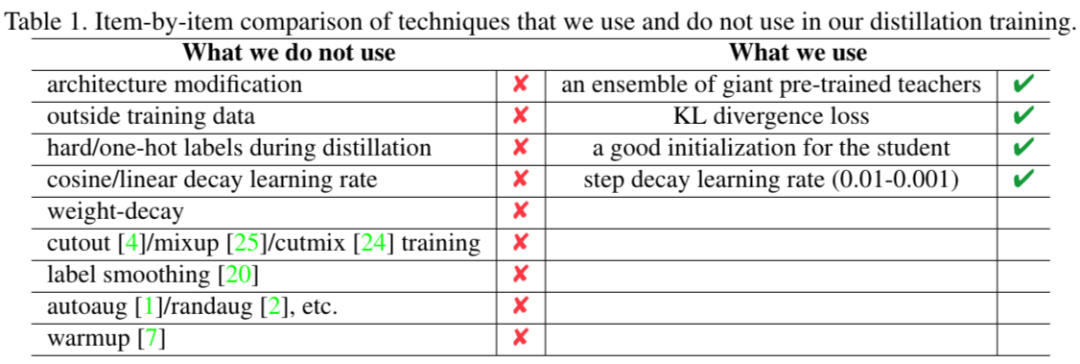 通常我们在训练网络的时候会用到很多技巧(tricks),但是在 MEAL V2 中,这些都是不需要的,作者罗列了他们使用到的和未使用到的一些训练手段,如下表格所示: