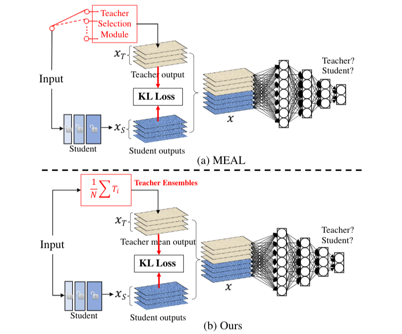 在介绍这个工作之前,首先要简单回顾一下它的最初版本 MEAL,其基本的也是核心的思想是将多个 teacher 网络的知识通过蒸馏的方式压缩进一个 student 里面,同时它提出使用辨别器(discriminators)作为正则模块(regularization)防止 student 的输出跟 teacher 过于相像,从而防止 student 过拟合到训练集上。
