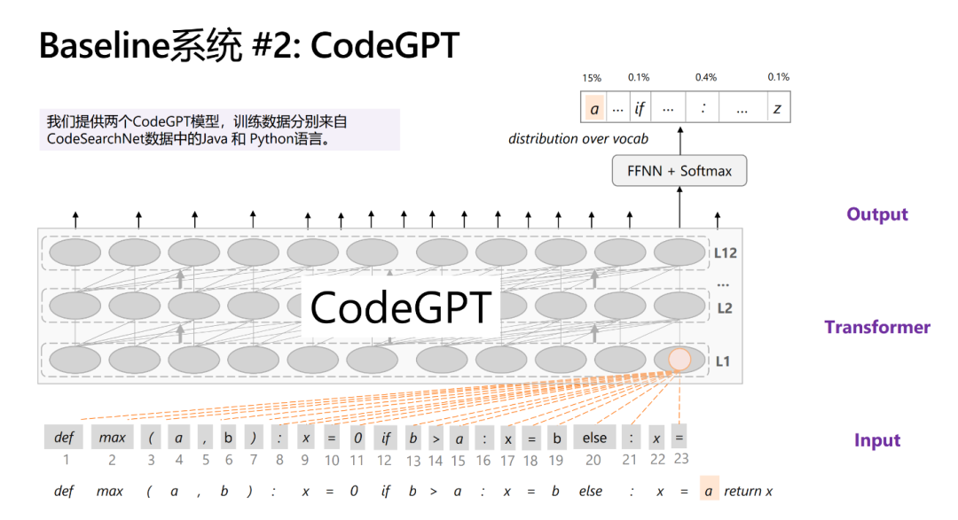 基于 CodeGPT 预训练模型的系统:GPT 模型在自然语言生成任务上取得了非常出色的效果,也有学者发现在编程语言上预训练 GPT 模型在代码生成任务上表现得很不错。为了帮助参赛者更快地搭建模型,研究员们分别在 Python 和 Java 两种编程语言上预训练了 GPT 模型,称之为 CodeGPT(如下图所示)。模型的训练数据来自CodeSearchNet,训练目标是传统的语言模型。参赛者只需在下游任务中对 CodeGPT 进行微调,即可在代码生成和补全任务上取得当前最好的性能。
