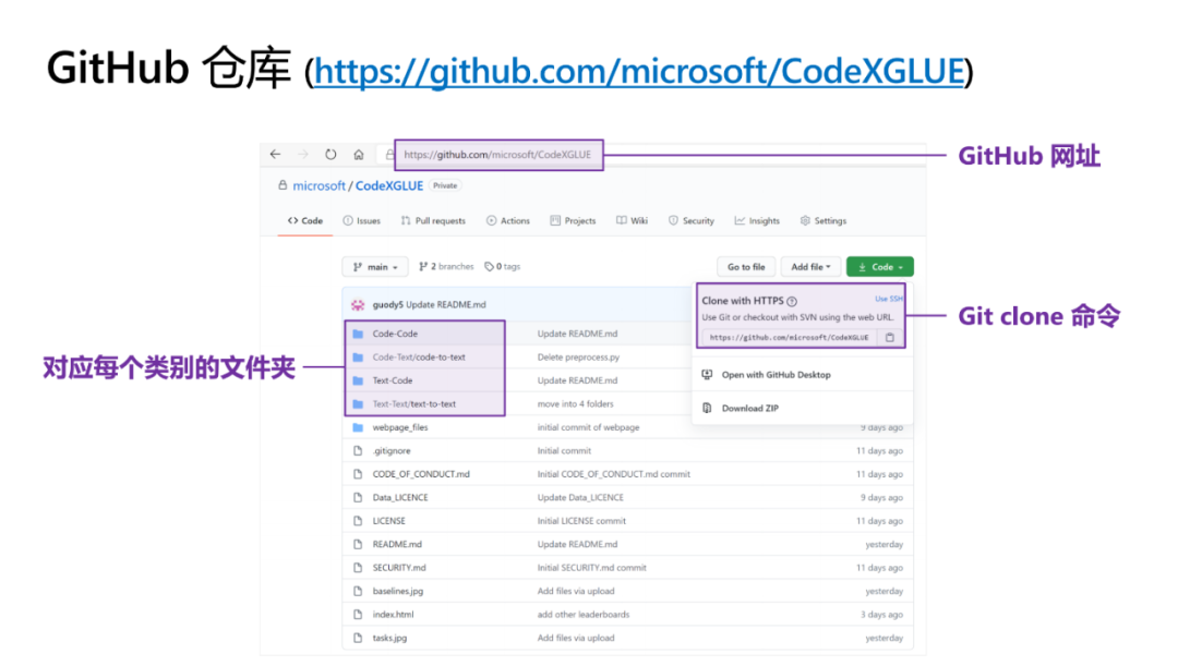 CodeXGLUE 发布在 GitHub 上,参赛者可首先通过 Git Clone 命令下载全部资源。最外层目录对应了四个任务分类,即 Code-code、 Code-text、Text-code 和 Text-text。研究员们为每个任务和数据集都创建了子文件夹,其中包括数据、代码、评测脚本以及说明文档。对于来自外部的公开数据集,则提供了数据下载的脚本;同时,对于需要做预处理的部分数据,也提供了预处理的脚本。