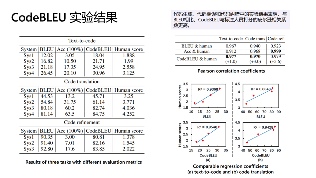 为了验证 CodeBLEU 指标的有效性,研究人员分别在代码生成、代码翻译和代码纠错上进行了实验。不仅为每个任务提供了多个系统的模型输出,并分别使用 BLEU、CodeBLEU 评测各个系统,此外还请了熟悉编程语言的人工标注人员为每个模型的输出打分。通过下图可以看出,CodeBLEU 与标注人员打分的皮尔逊相关系数更高,从而验证了该指标的有效性。更多细节,请参见论文:CodeBLEU: a Method for Automatic Evaluation of Code Synthesis ( https://arxiv.org/abs/2009.10297 )。